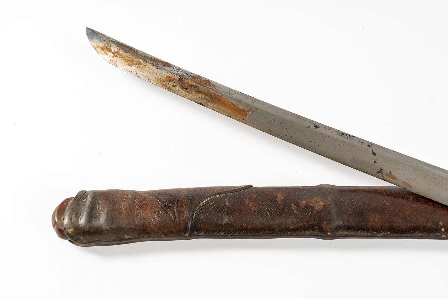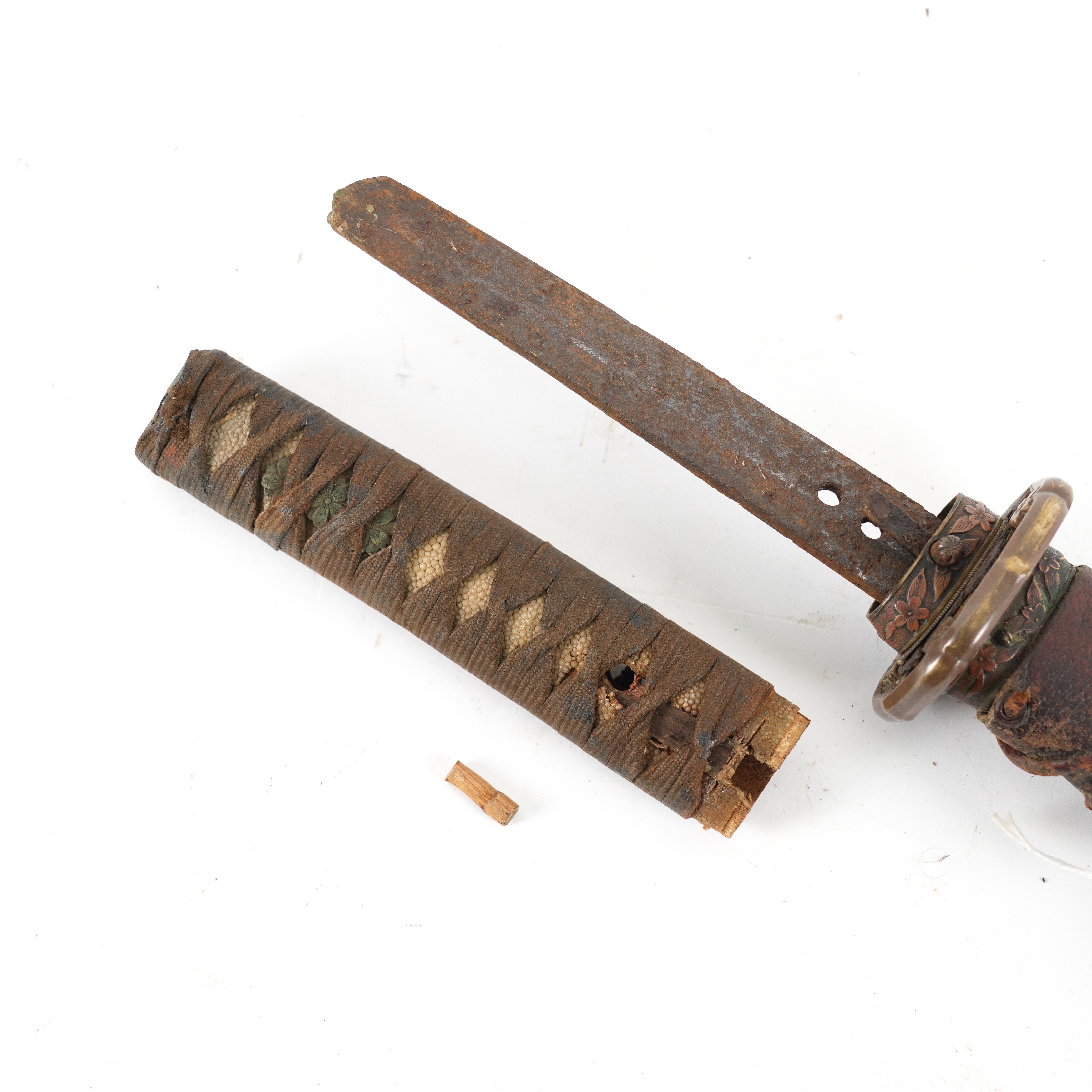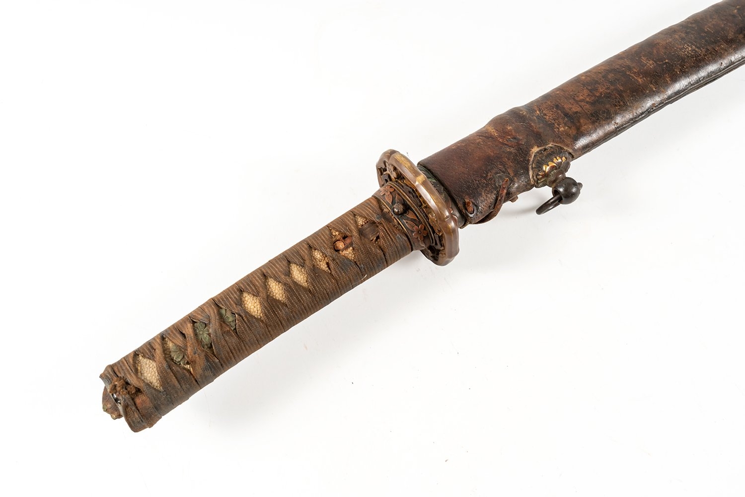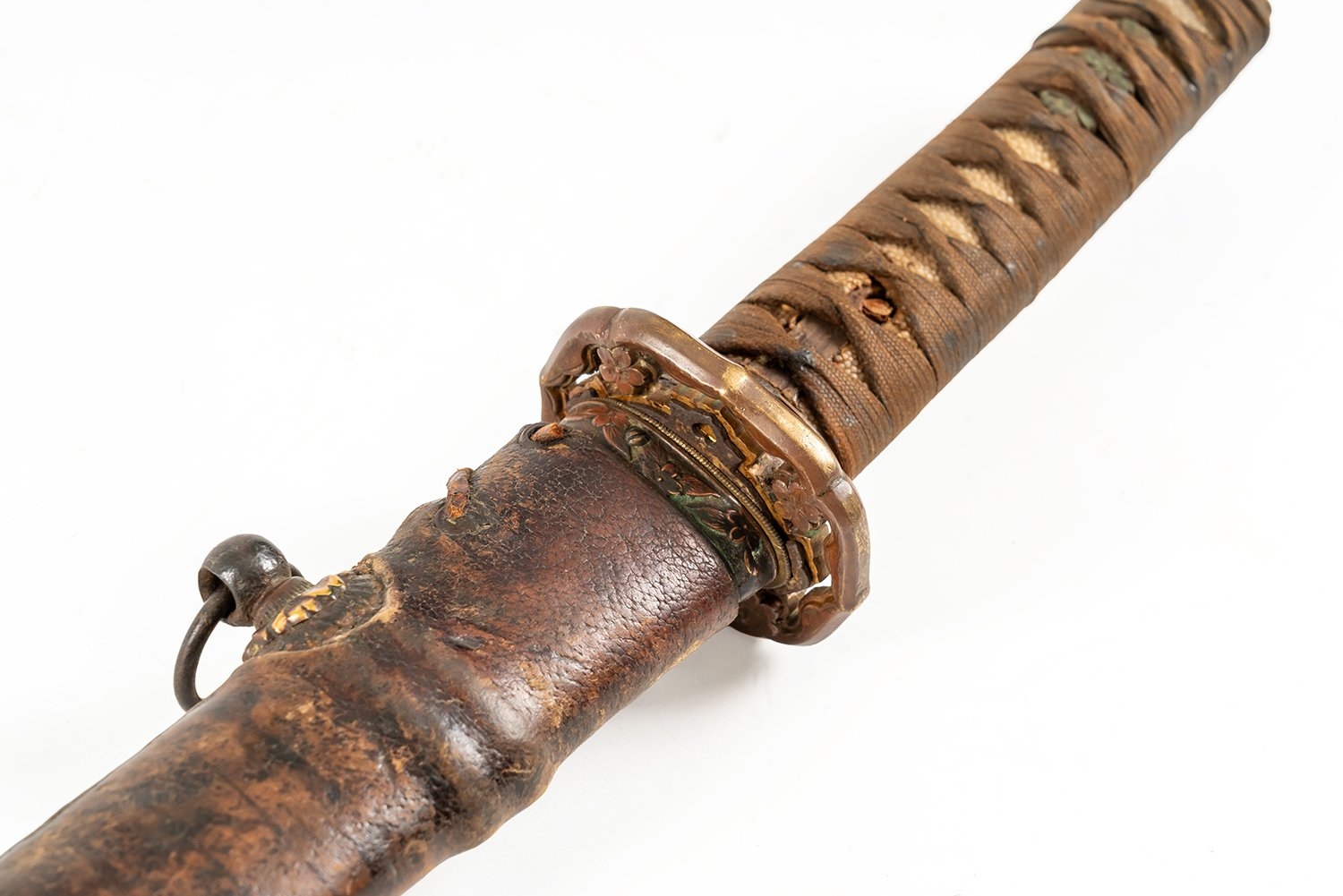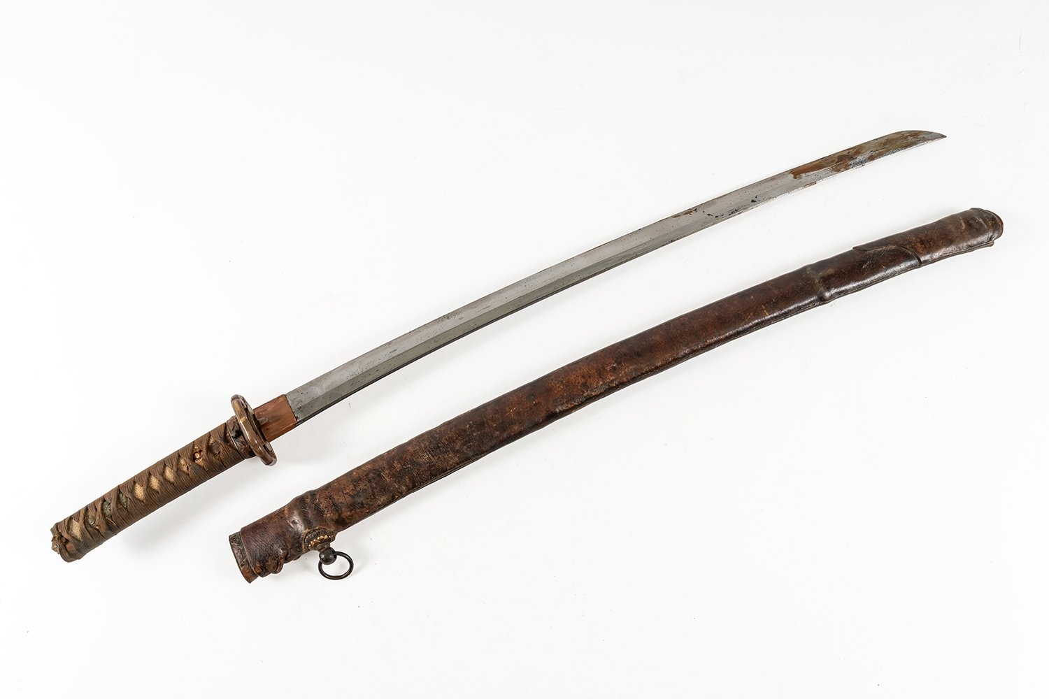 A World War II period shin-gunto katana with traditional tsuba, brass military mounts, and ray-skin grip bound with brown silk. The tang shows two holes, with signs of earlier blade remounting. Complete with leather-covered scabbard and original leather field combat cover. The tang bears a two-hole mounting (niju mekugi-ana), suggesting the blade may be older than its WWII-era shin-gunto mounts. The mei (signature) appears partially obscured, overall length 93cm