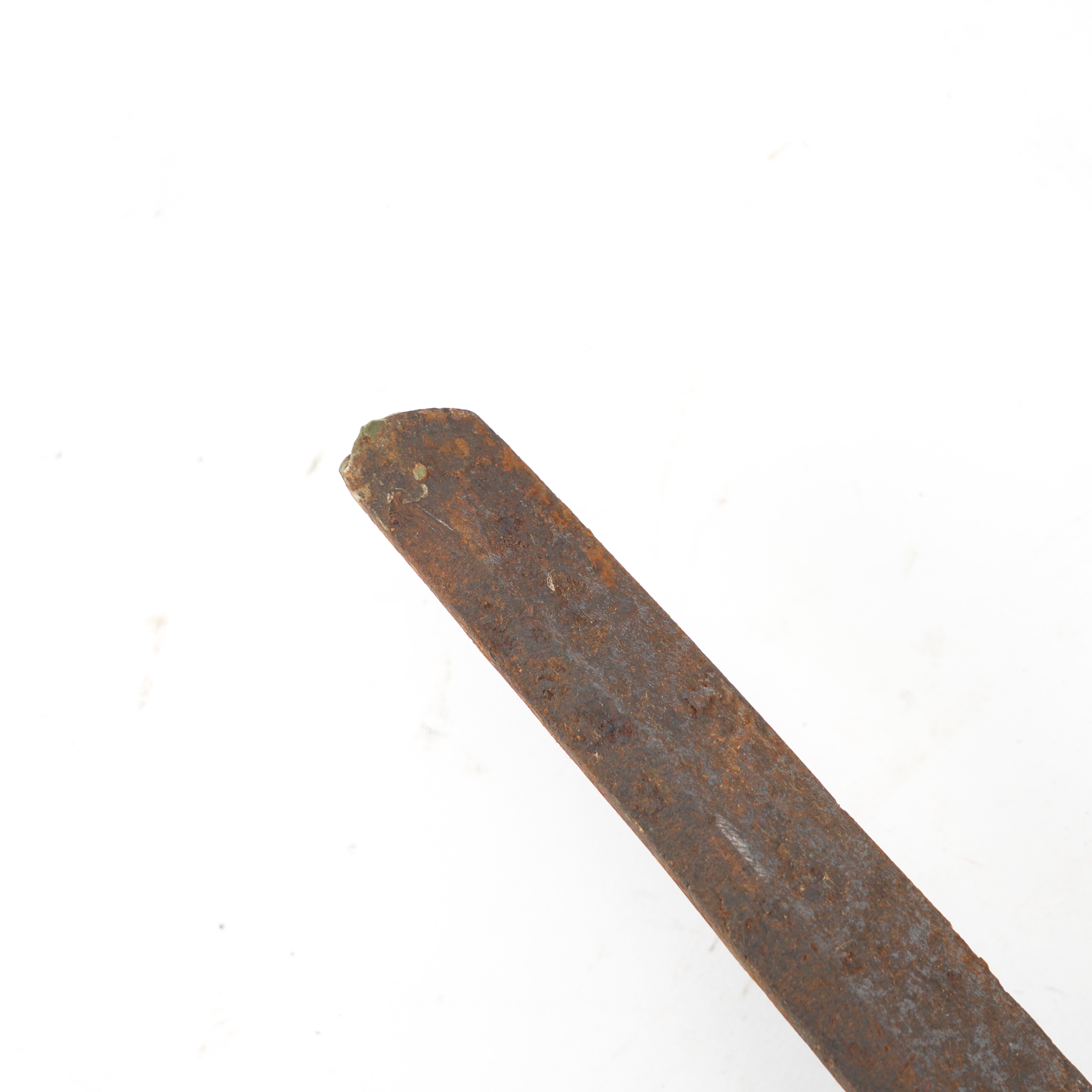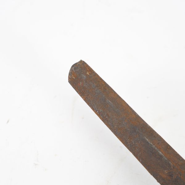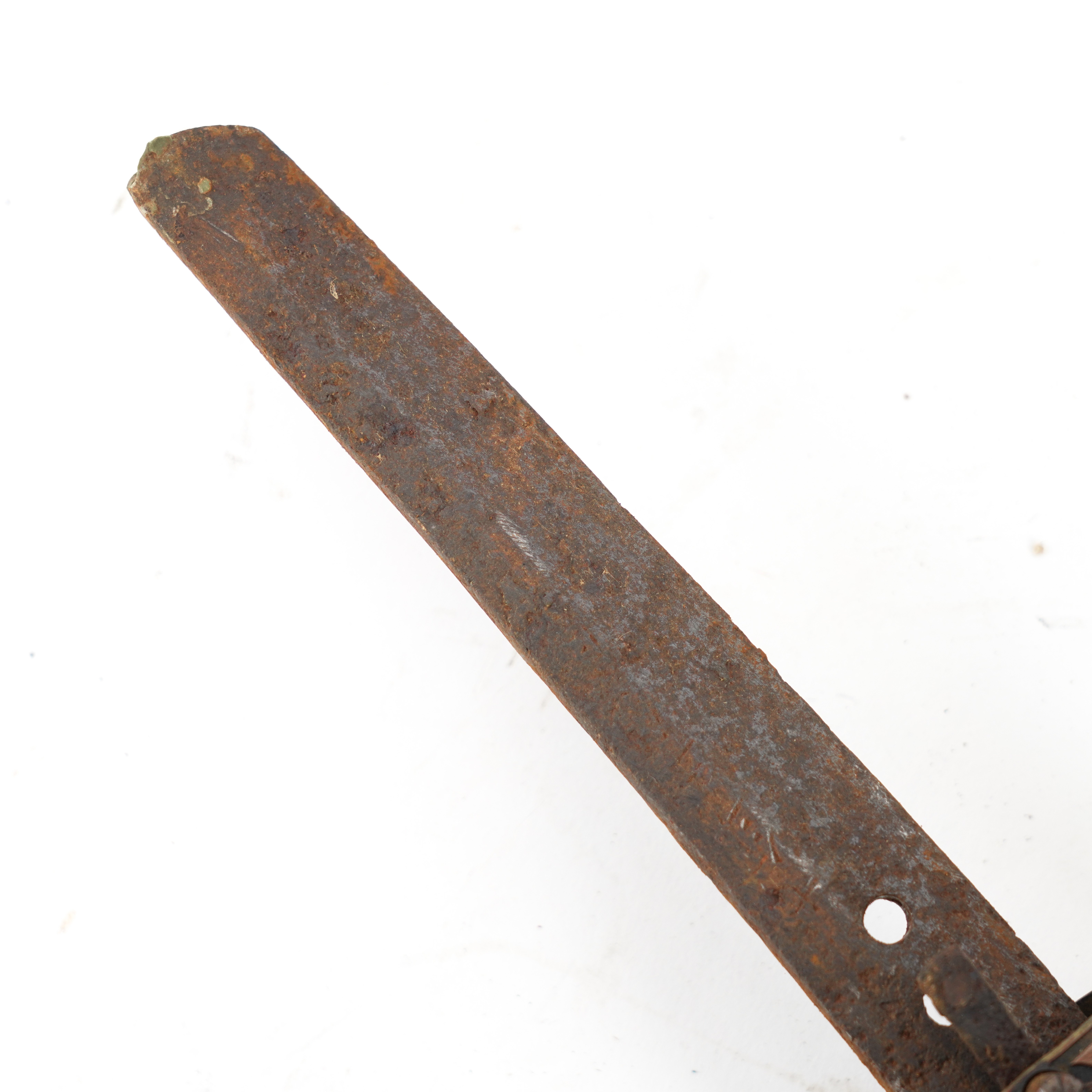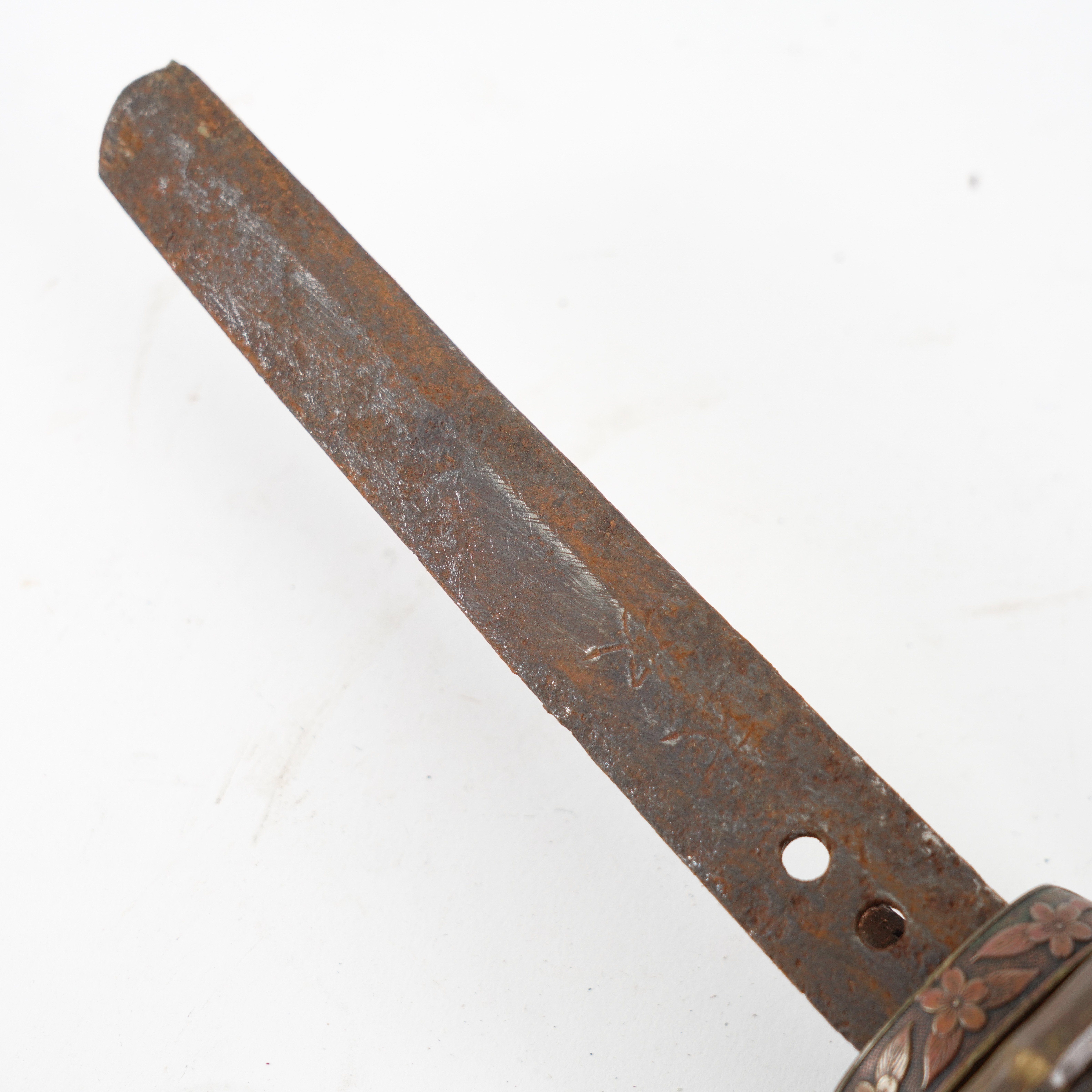 The tang bears a two-hole mounting (niju mekugi-ana) suggesting the blade may be older than its WWII-era shin-gunto mounts. The mei appears to be a partially obscured kanji inscription, potentially indicating the smith’s name and/or province, though it is not fully legible in the photo. From what can be discerned, this could possibly be a Showa-to(machine-assisted WWII-era blade), though the double mekugi-ana opens the possibility of an older re-mounted blade (gendaito or earlier). To confirm, further close-up imaging and rust removal (by a specialist) would be required.