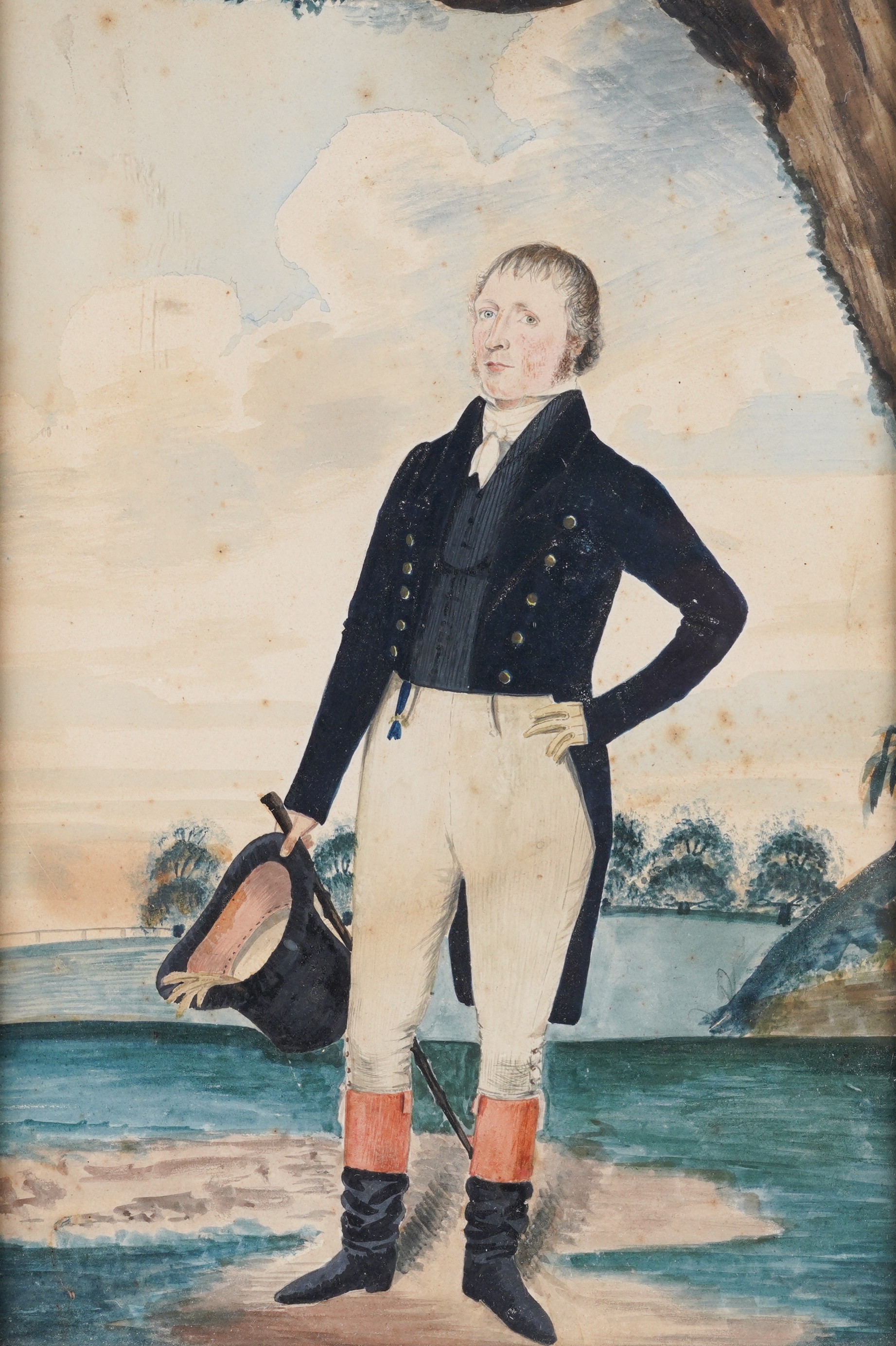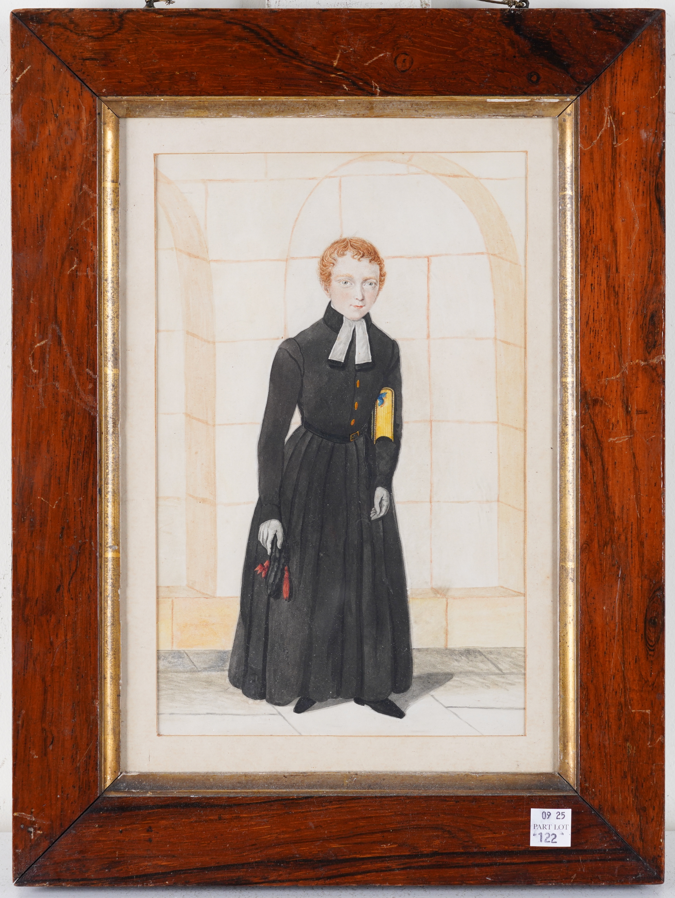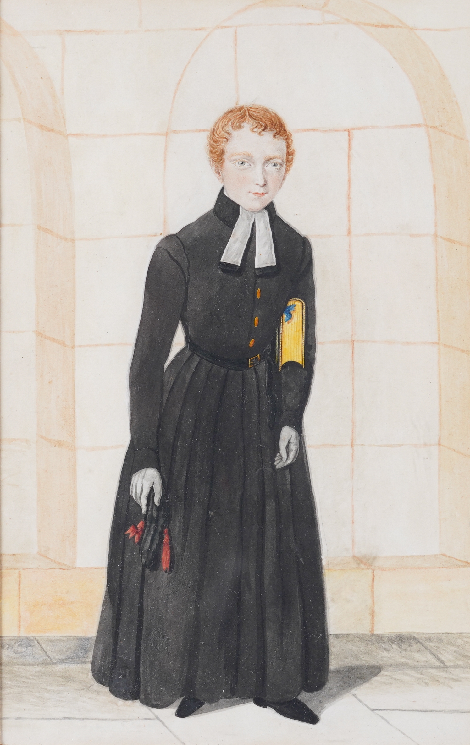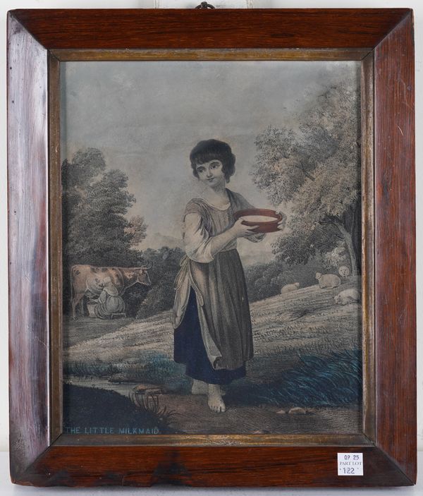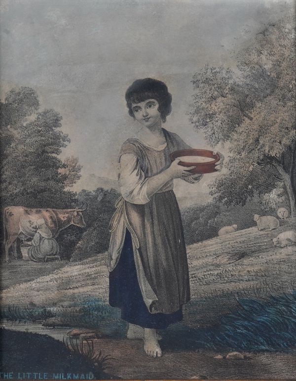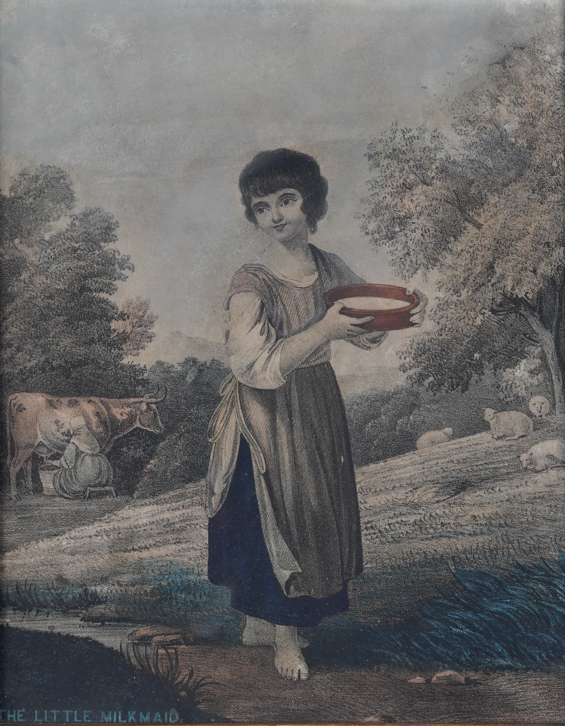 together with a 19th century watercolour of a gentleman, 30 x 20cm; A 19th century portrait of a boy with book under his arm, 25 x 16cm; and an engraving of The Little Milkmaid, 27 x 21.5cm