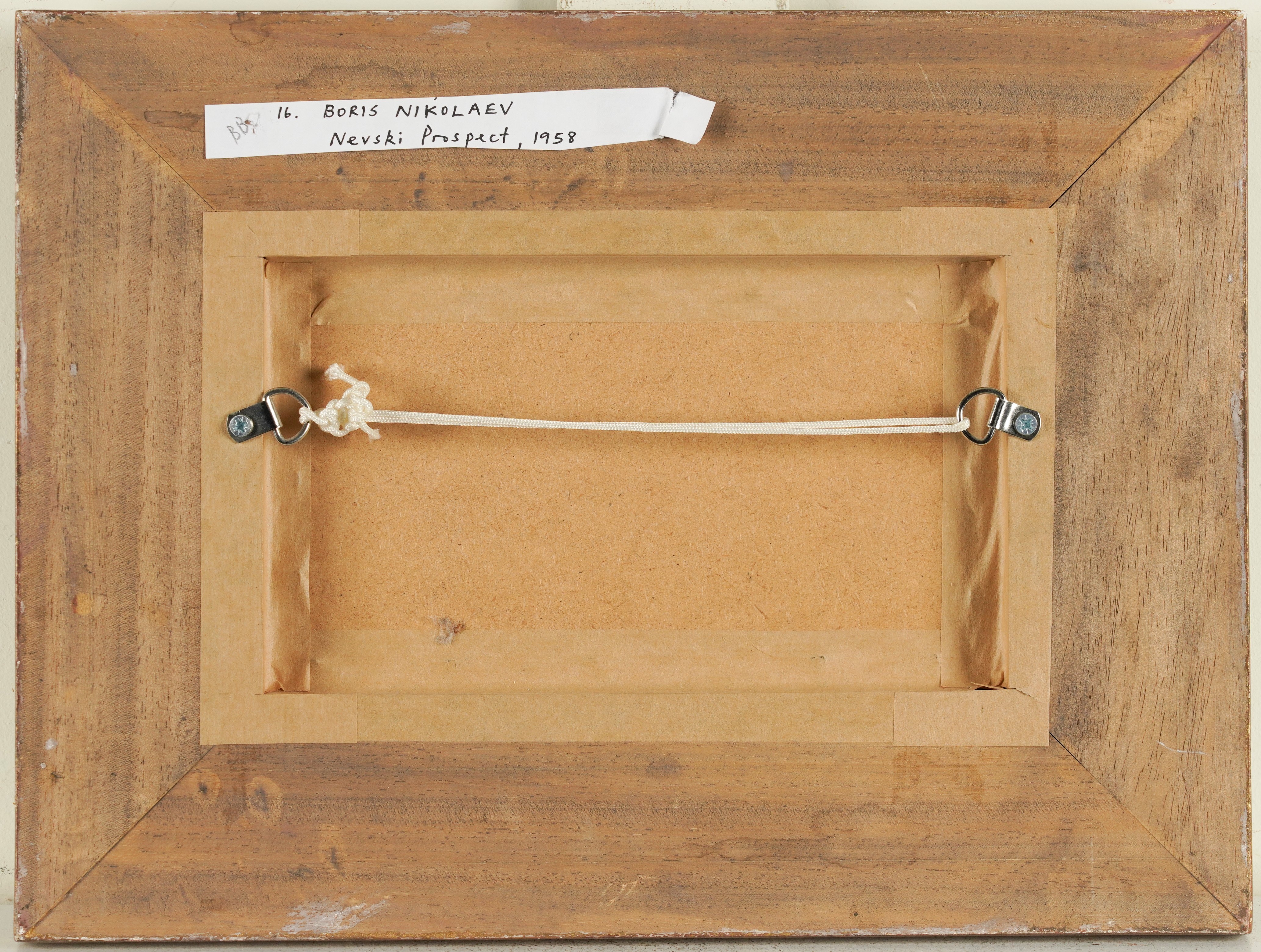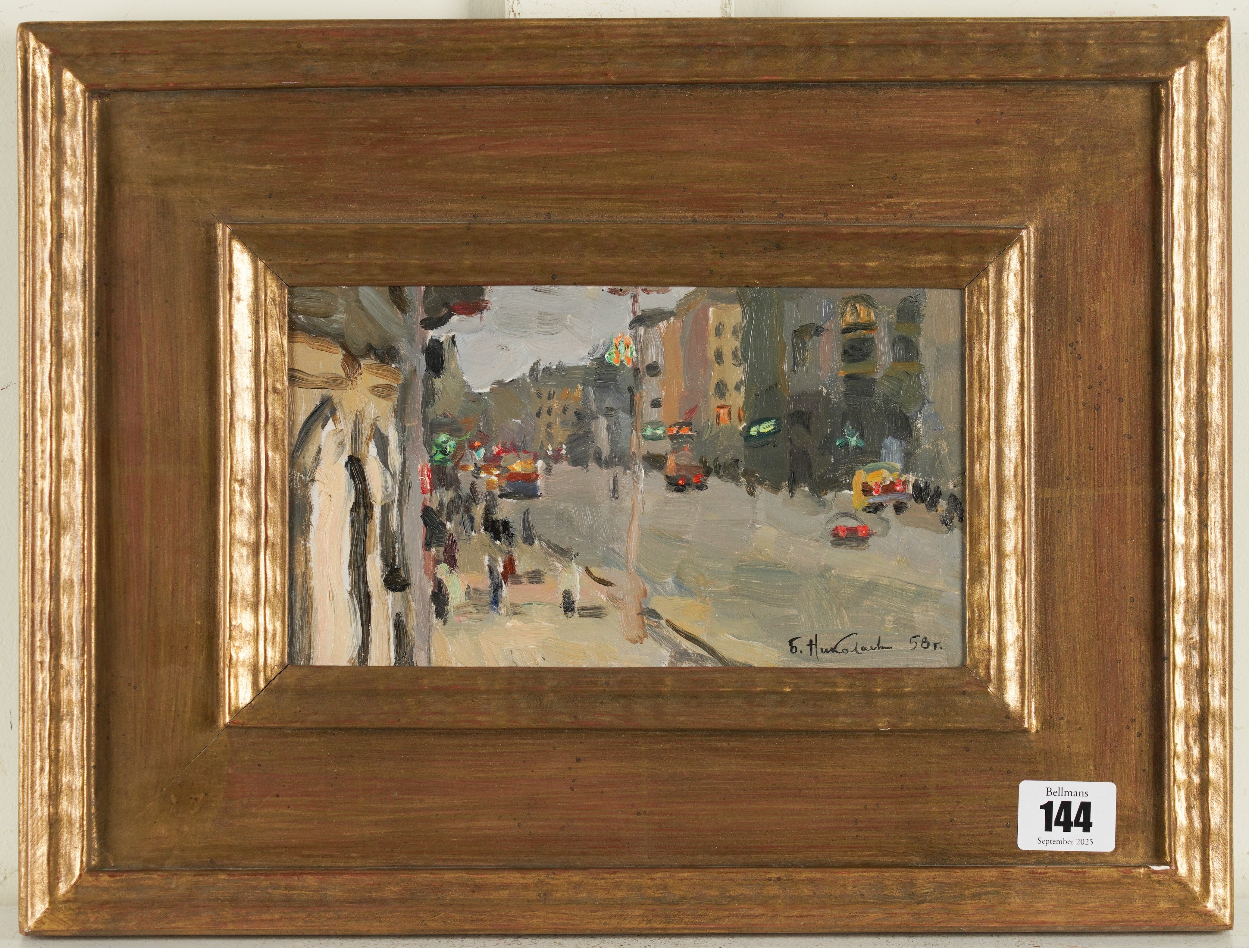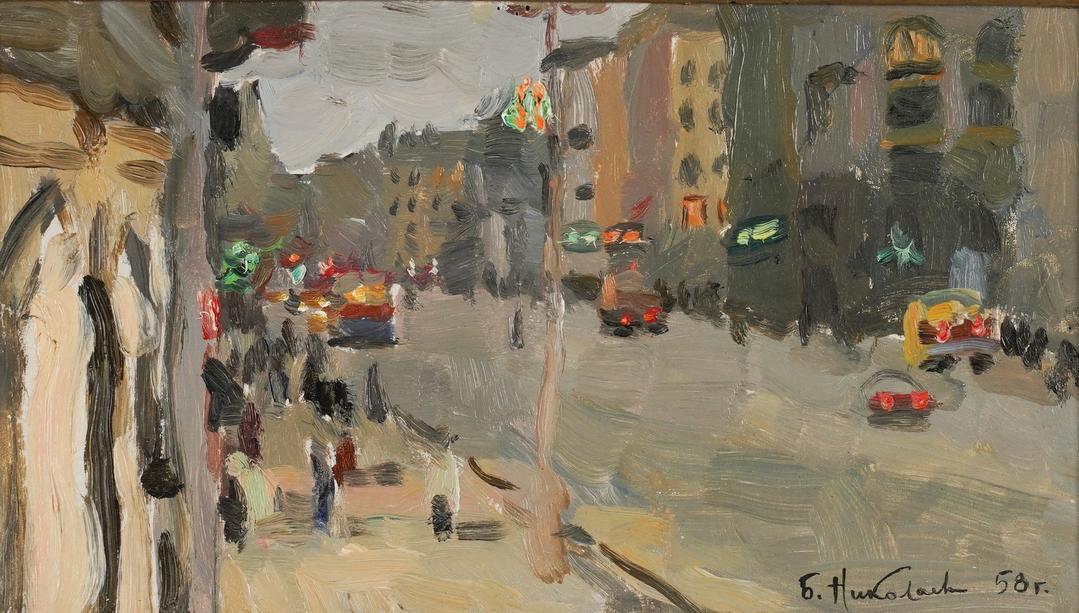 Nevsky Prospect, St Petersburg signed in cyrillic and dated '58r.' (lower right) oil on board 13.5 x 23cm