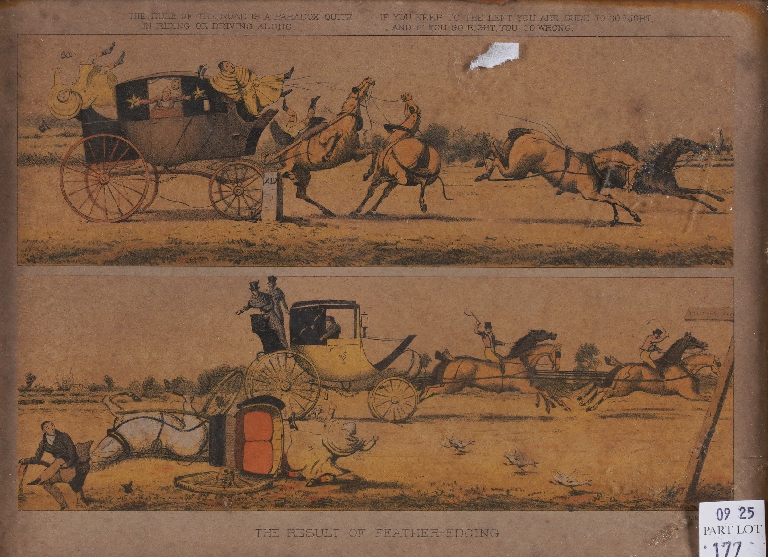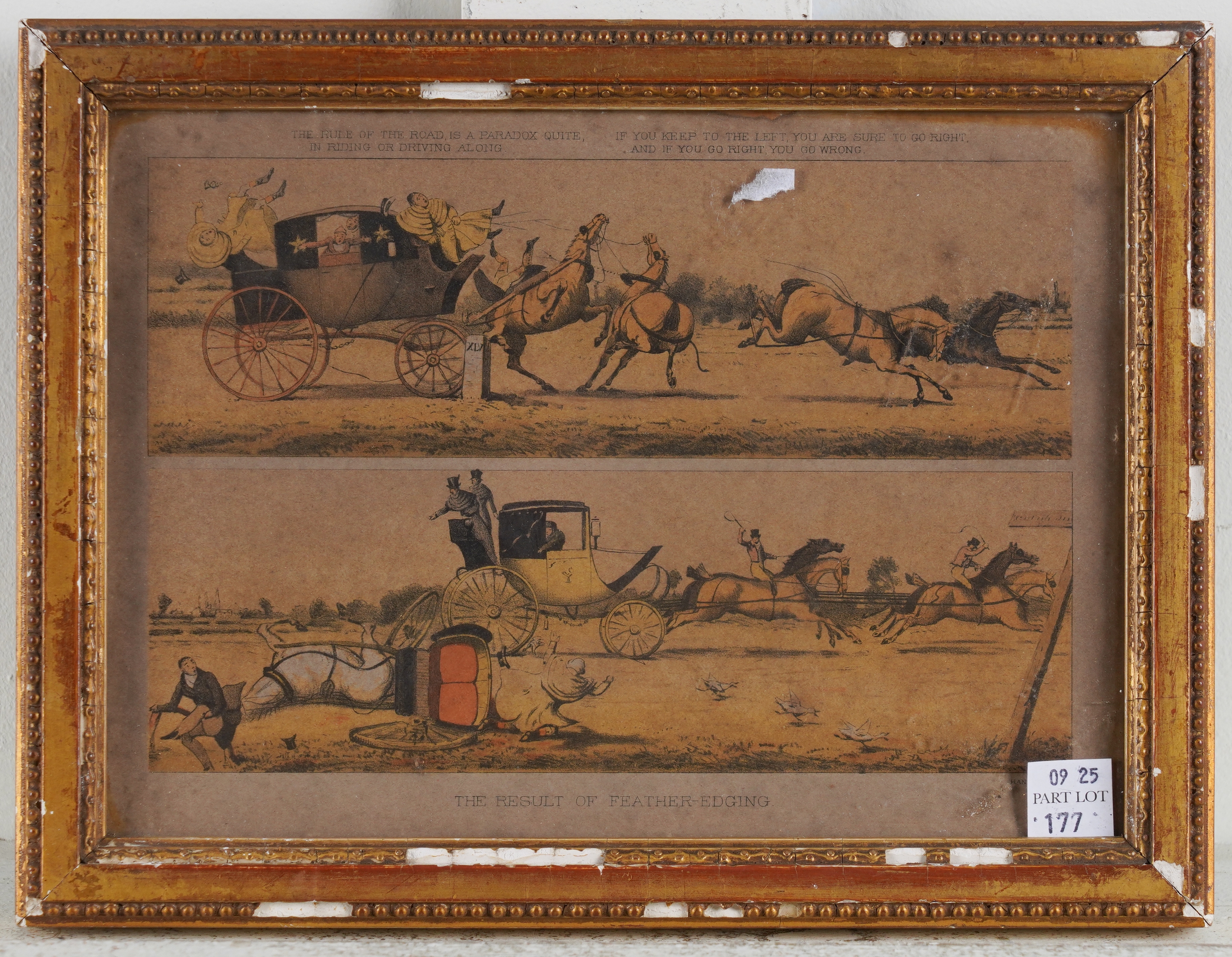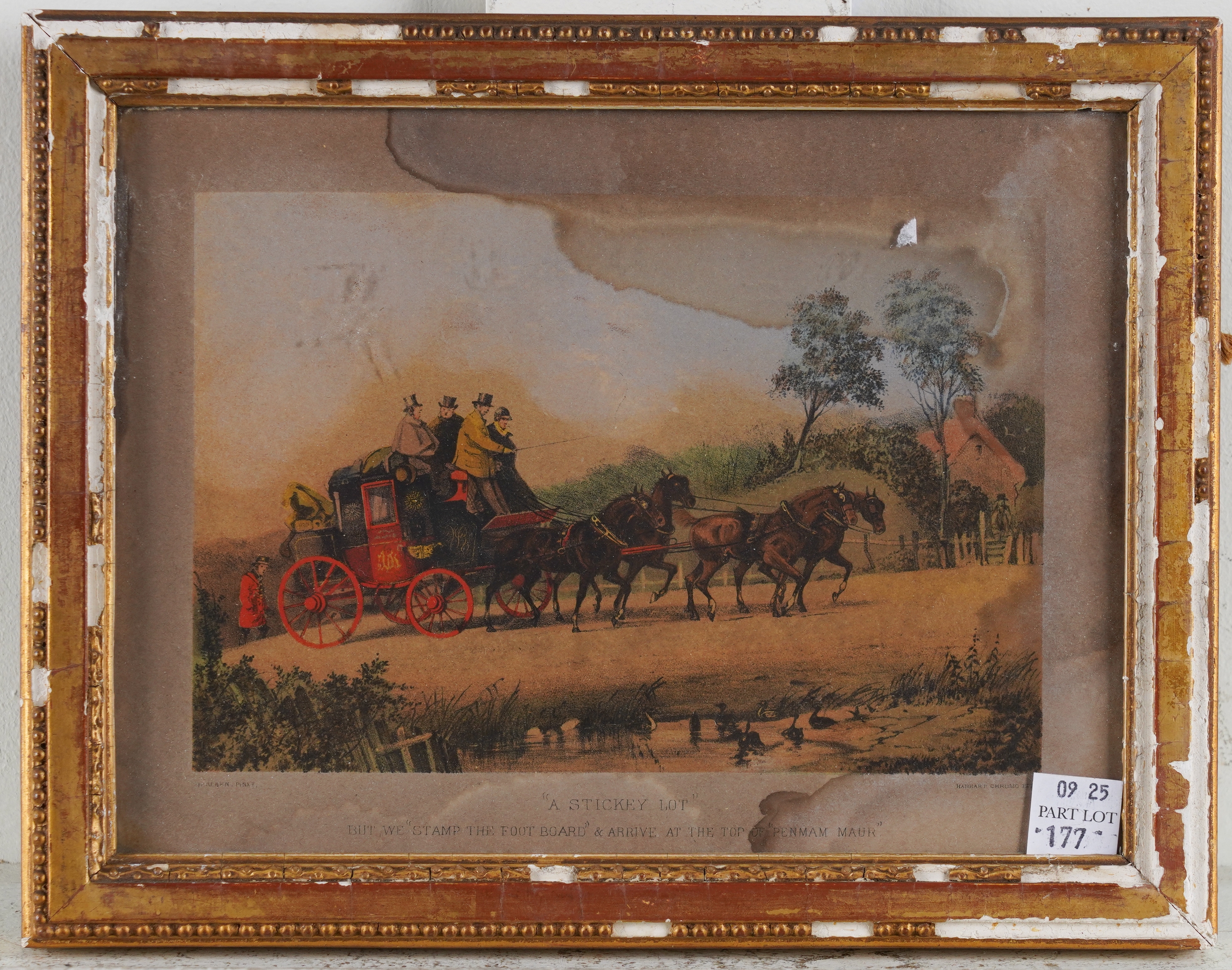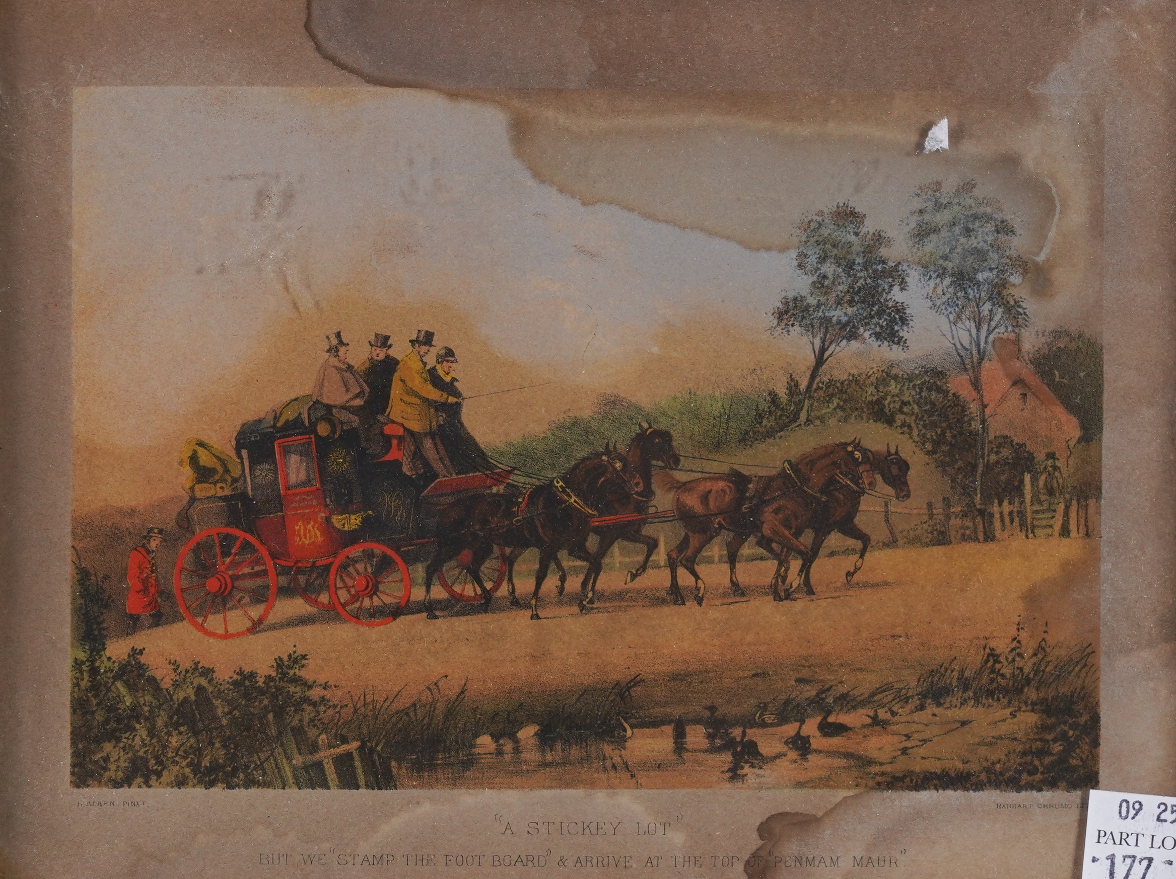 together with another watercolour of flowers by the same hand, 22.5 x 31.5cm; a 19th century watercolour by another hand of a river scene, 15 x 20cm; and seven prints of coaching scenes (4 unframed)