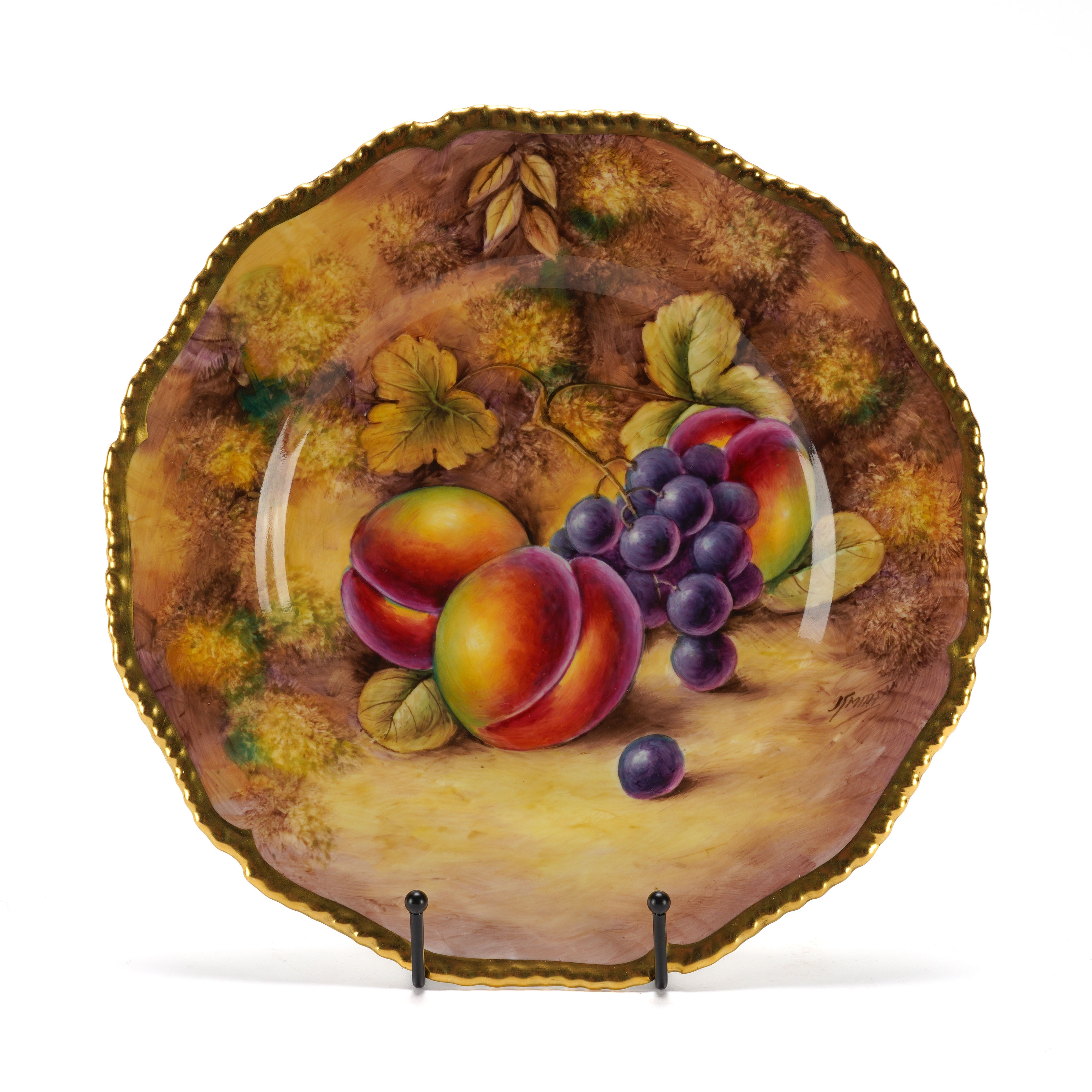 Painted with an arrangement of fruit by J.Smith signed, inside a gilt gadroon moulded rim, black printed mark, 27cm diameter