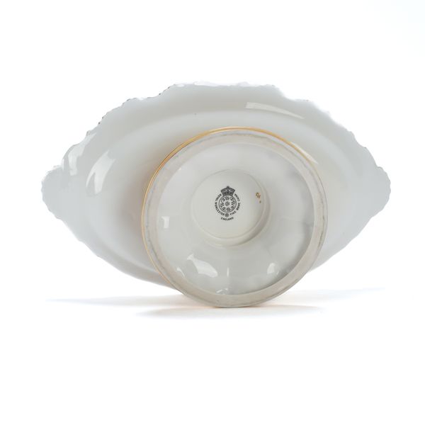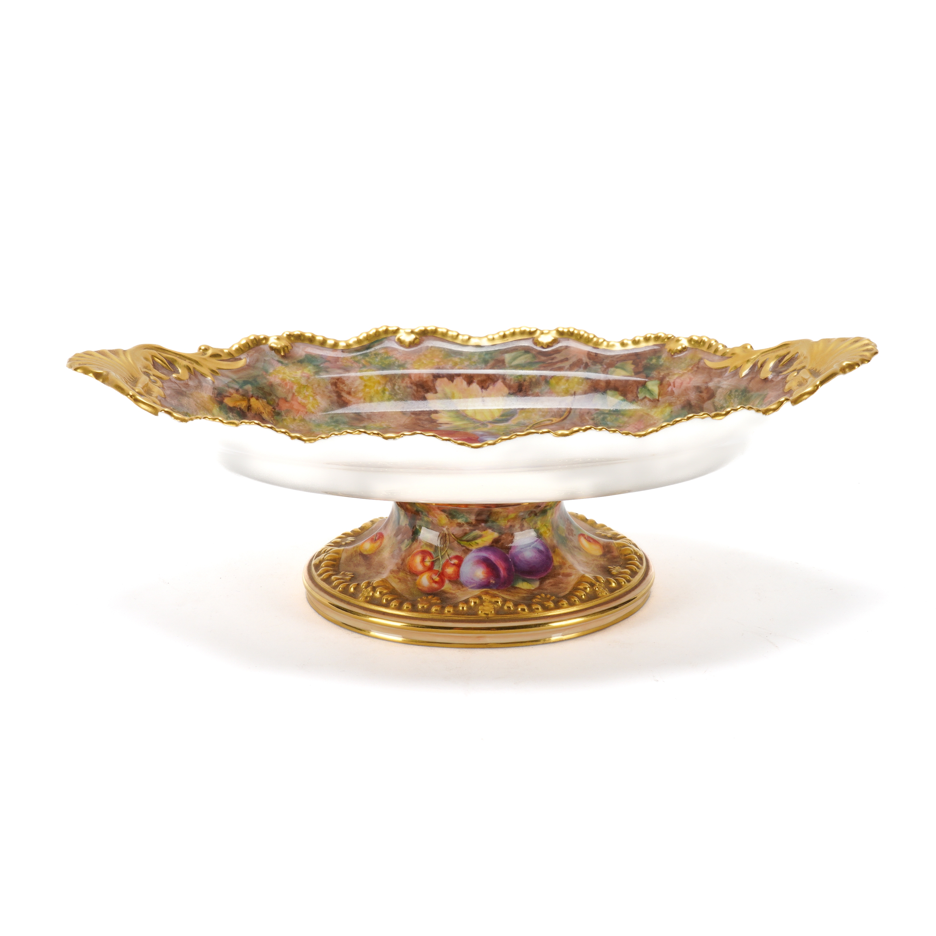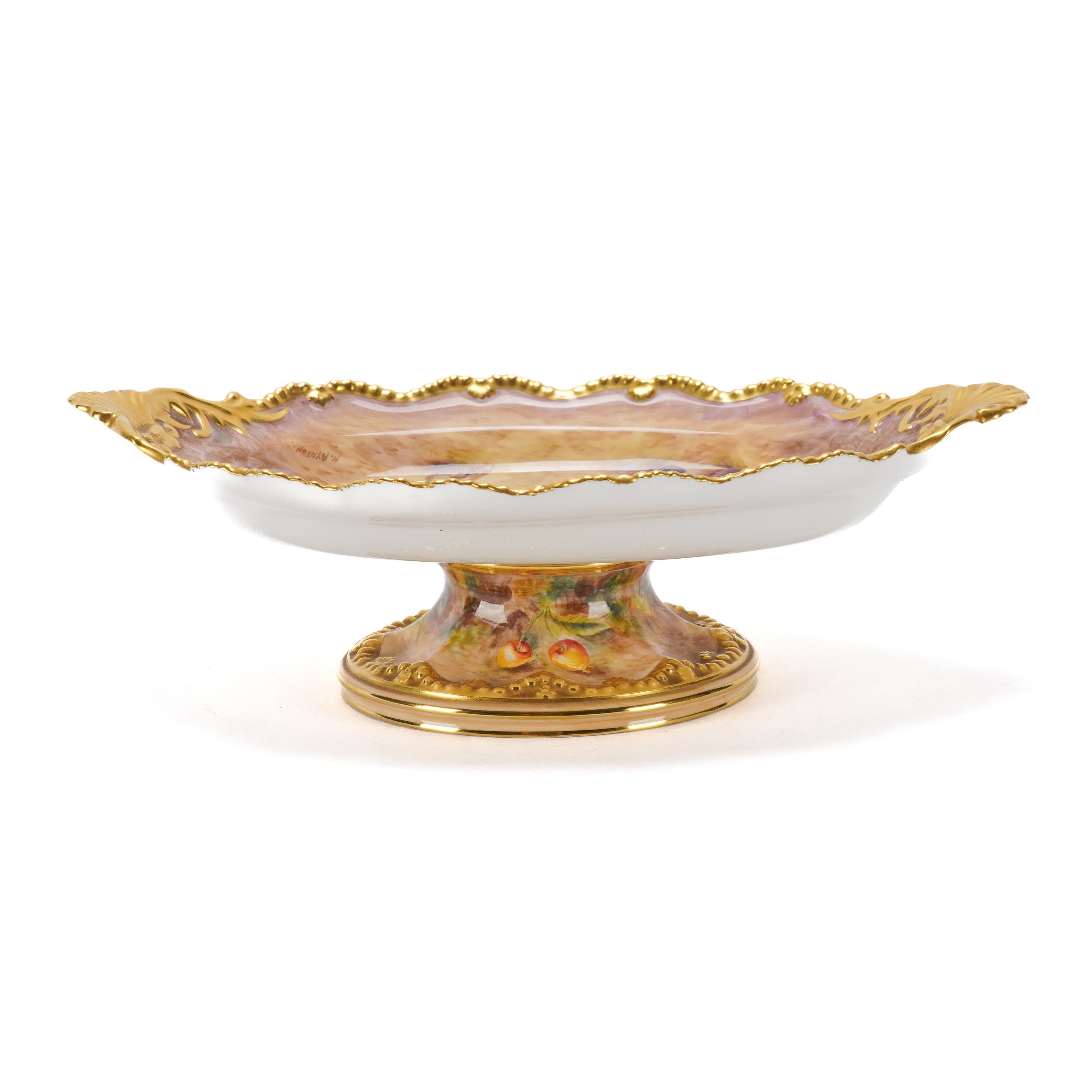 Of shaped oval form, painted with fruit by H.Aryton, signed, with gilt gadroon and shell moulded borders, black printed mark, 30.5cm length