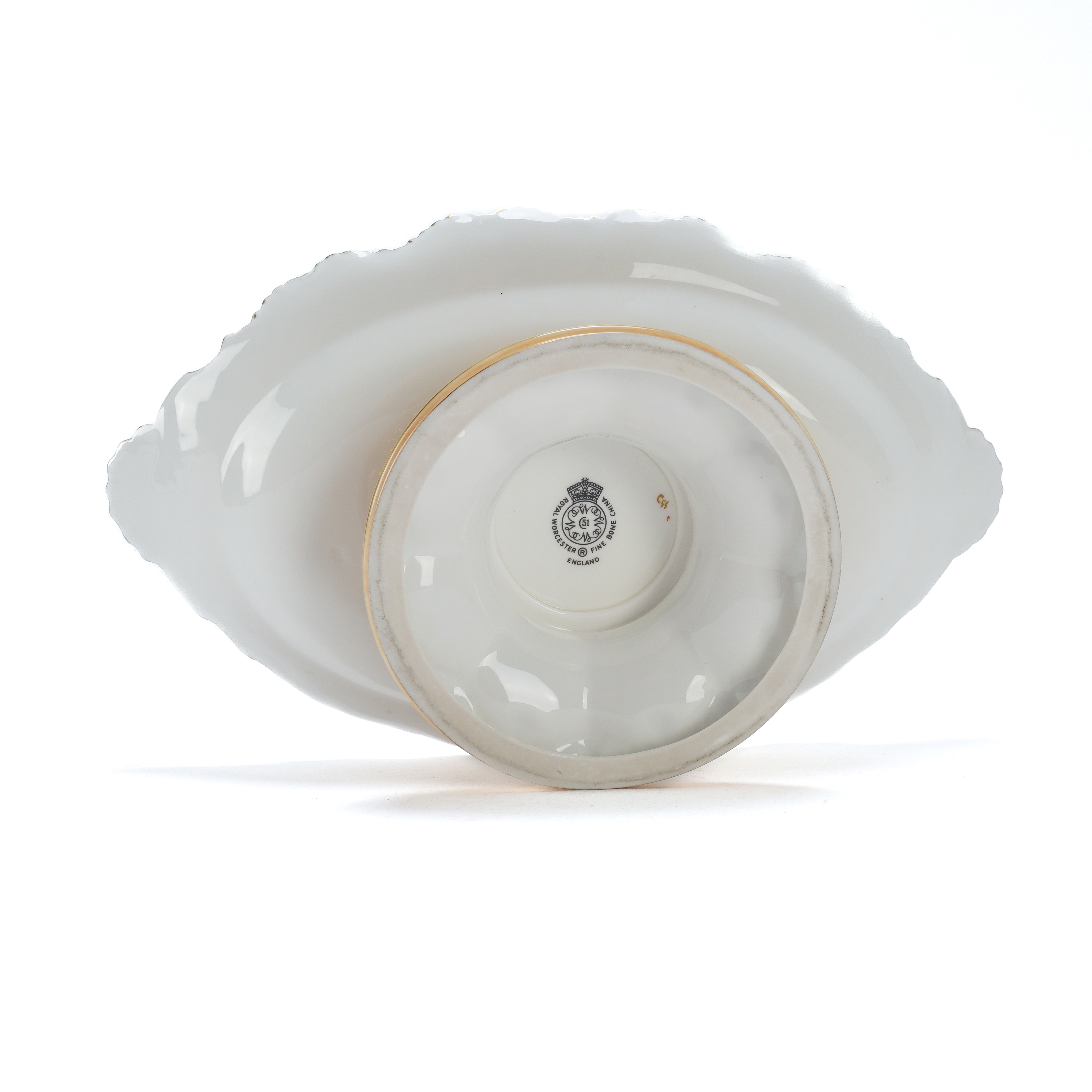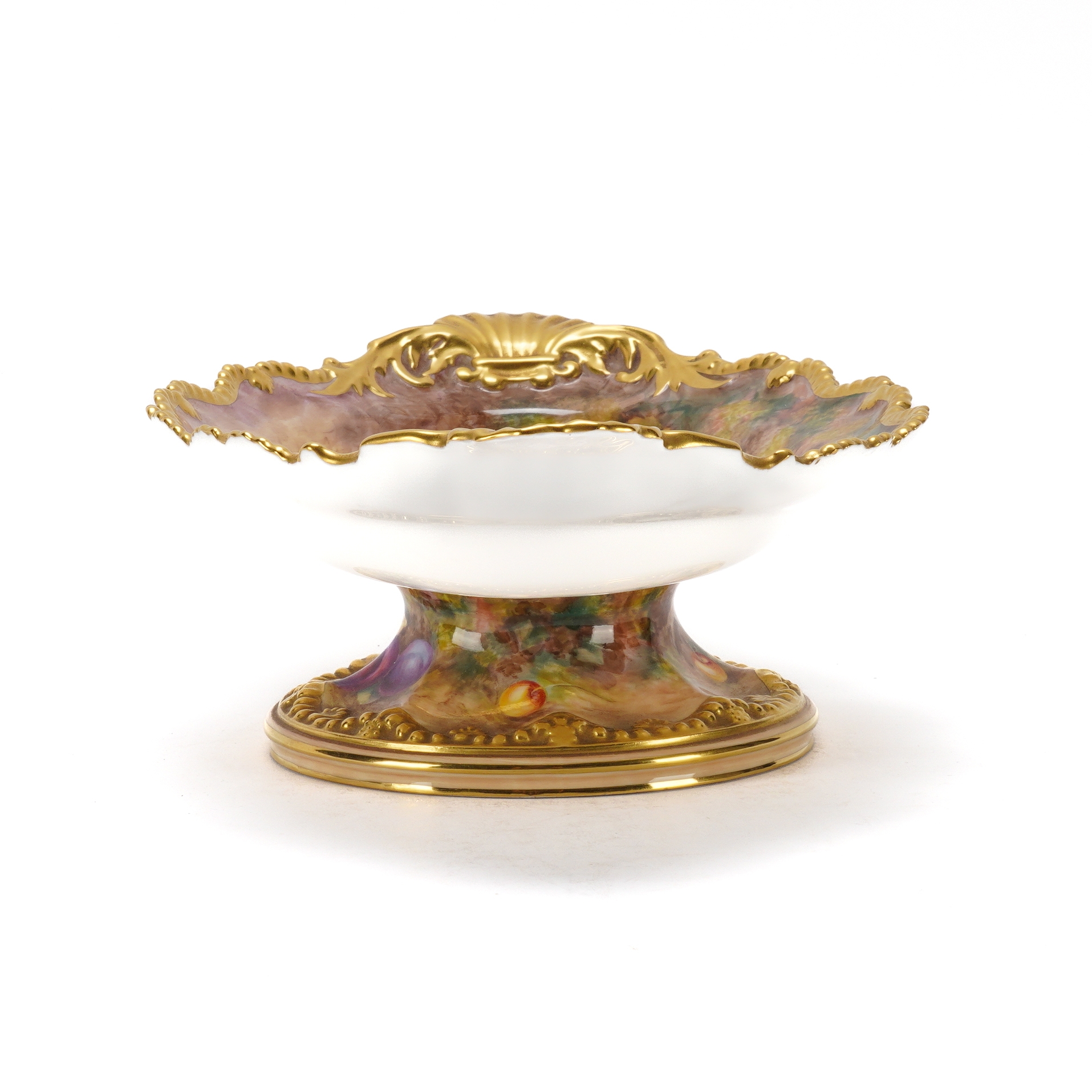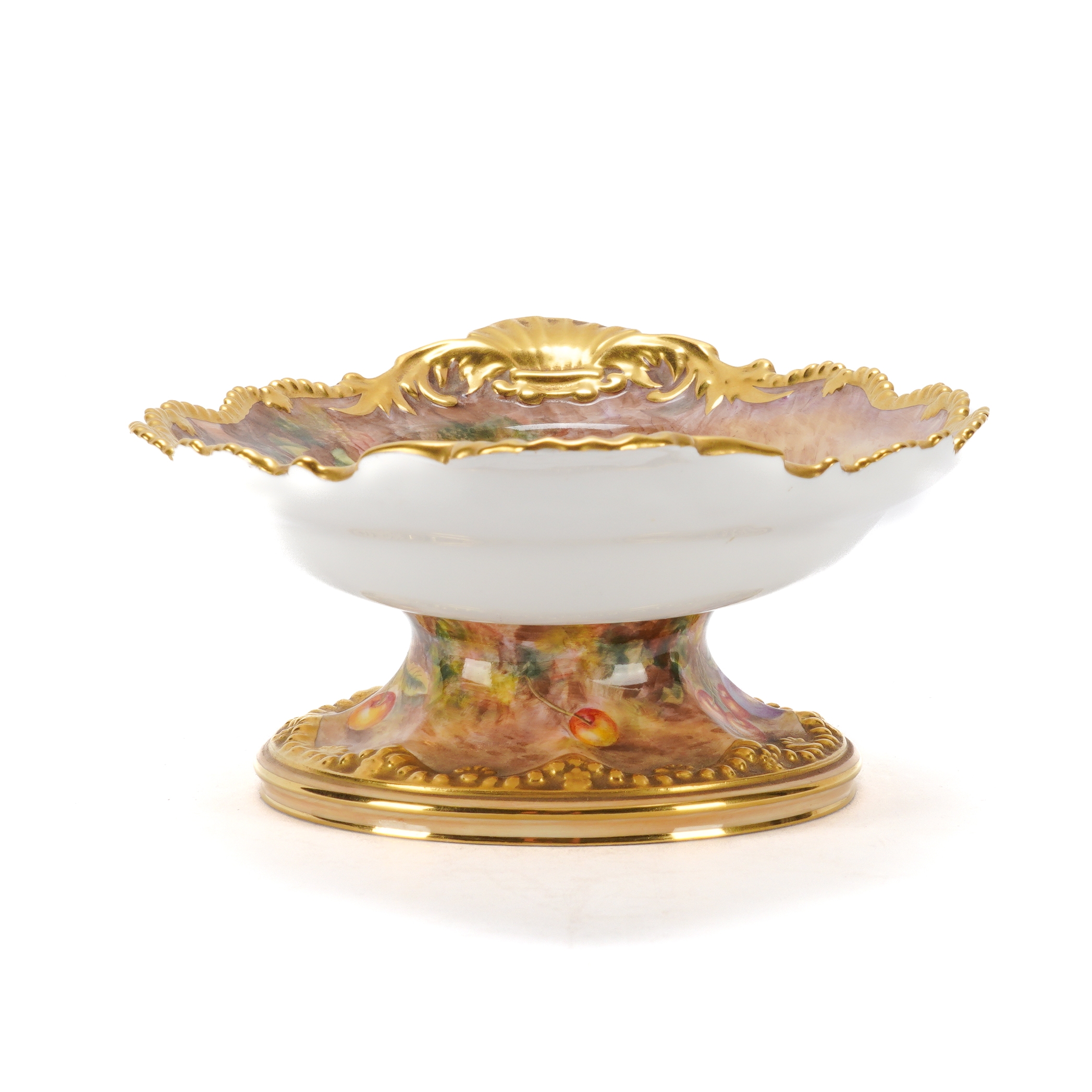 Of shaped oval form, painted with fruit by H.Aryton, signed, with gilt gadroon and shell moulded borders, black printed mark, 30.5cm length
