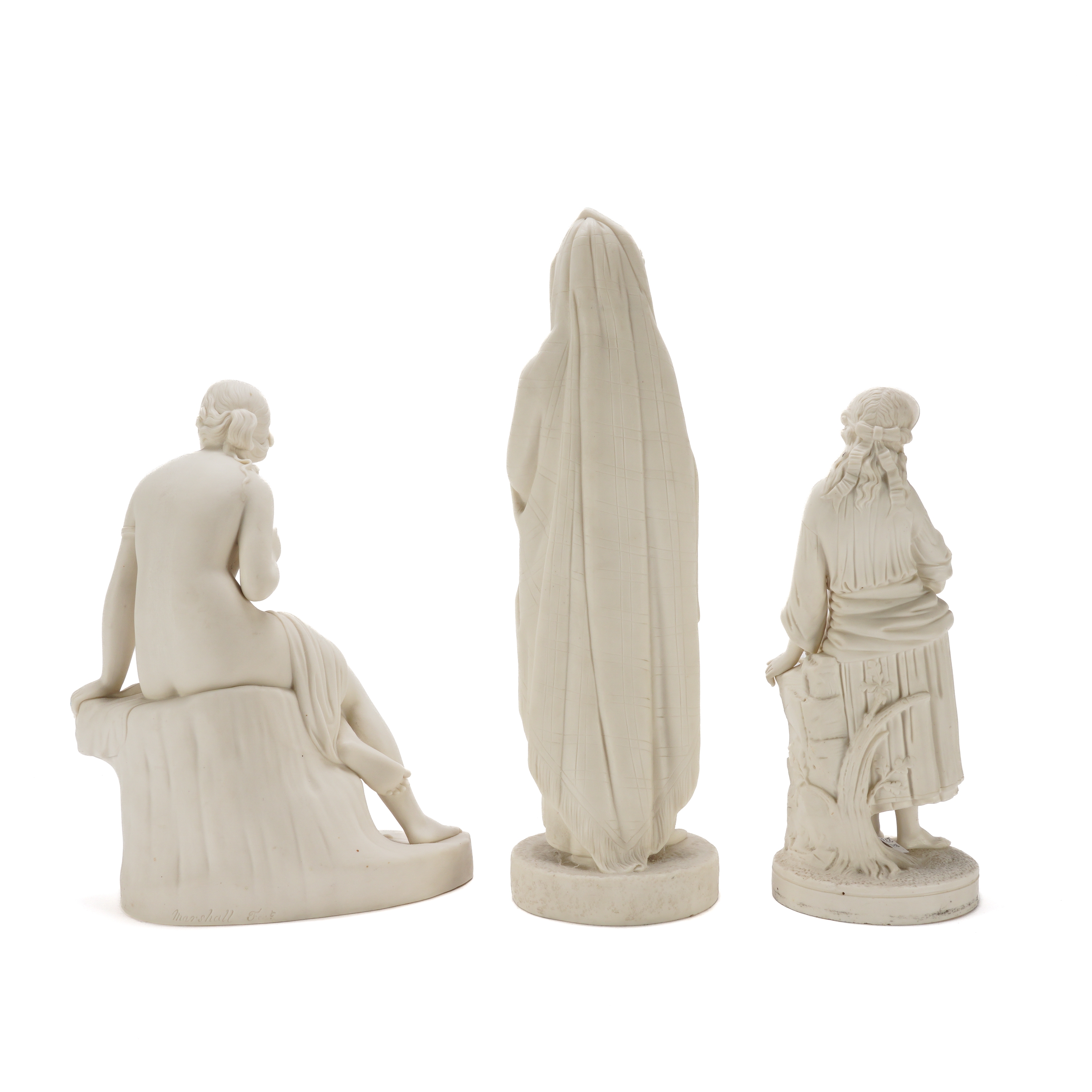 Modelled by W Calder Marshall, impressed mark, 31cm high; also a Parian figure of a young woman titled 'Jeanie Deans' after William Beattie, 40cm high and a smaller Parian figure of a standing young woman, unmarked, 29cm high