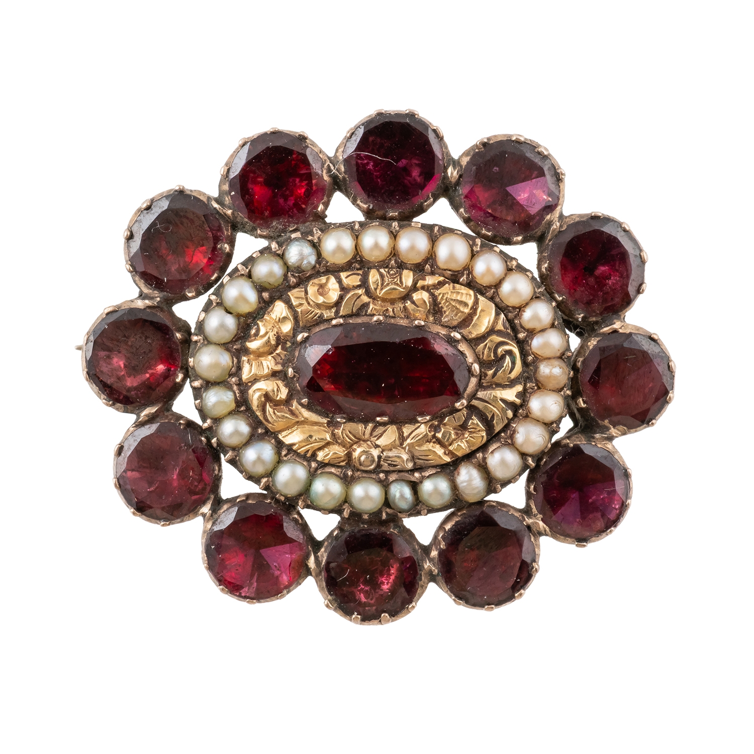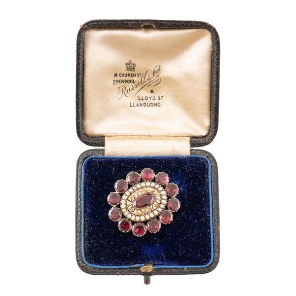 With seed pearls and flat cut garnets, in a closed back setting, measuring 28.6mm x 24.8mm, unmarked, gross weight 6.6 grams, with a box
